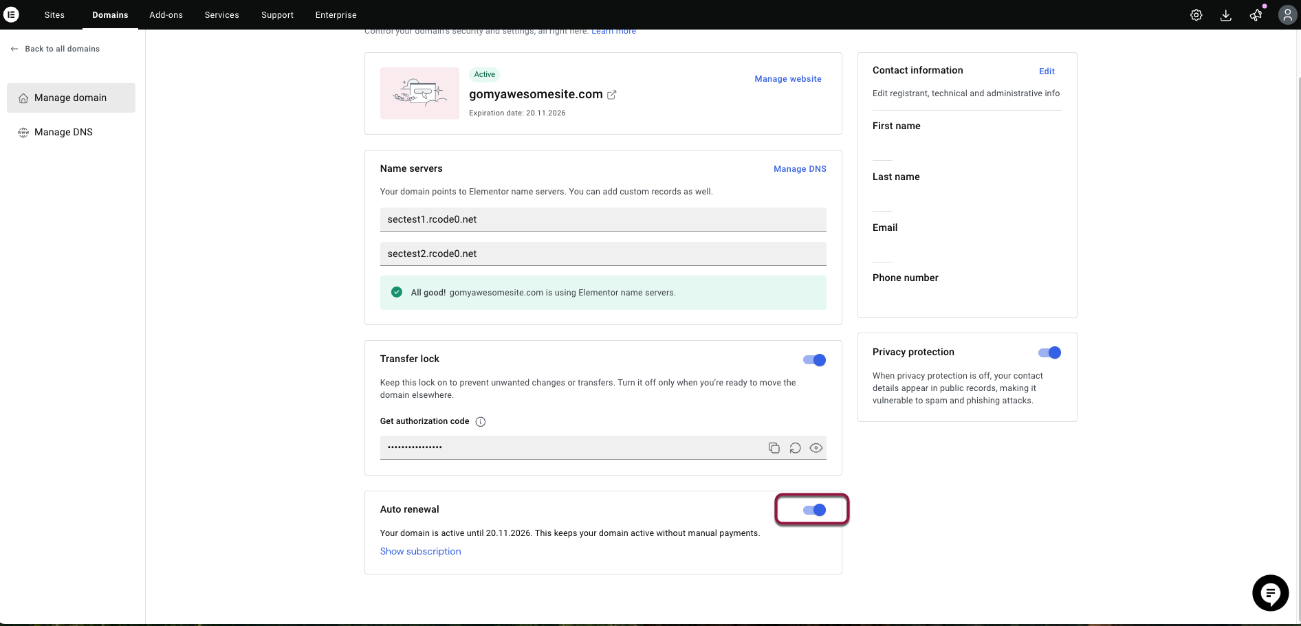 When auto renewal is enabled, your domain will renew automatically before its expiration date, ensuring it stays active without interruption. You can click Show subscription to view your renewal details and billing date.