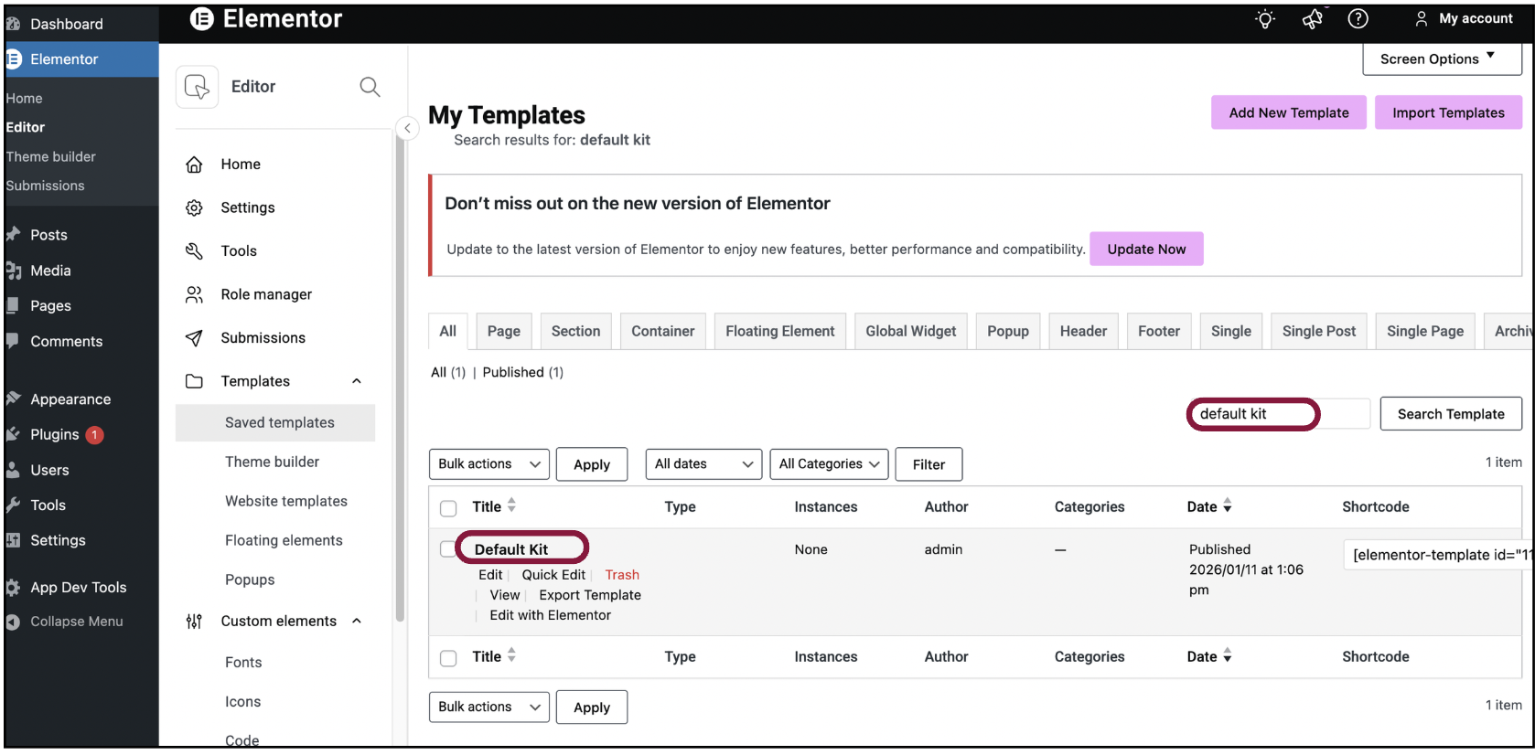 - Navigate to Elementor > Editor >Templates > Saved Templates. List of saved templates appear.