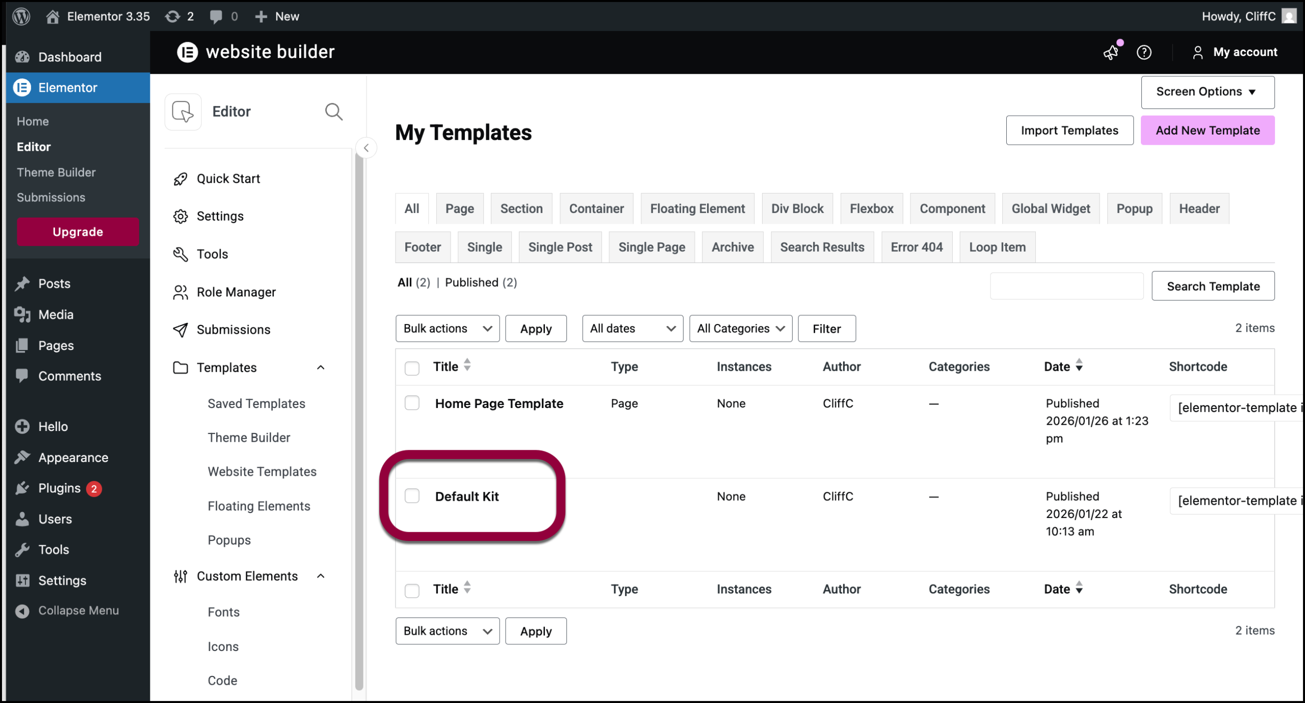 - From WP Admin, navigate to Elementor>Editor>Templates.