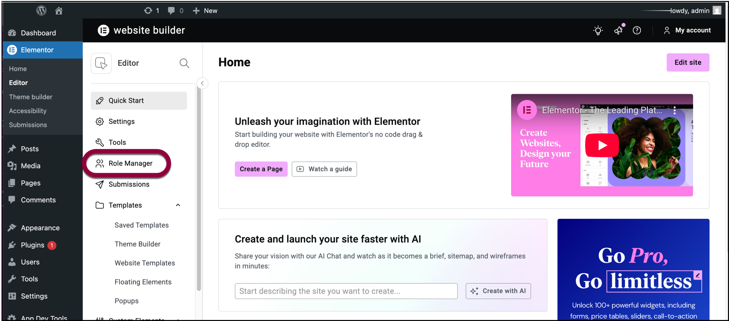 - From WP Admin navigate to Elementor>Editor>Home.