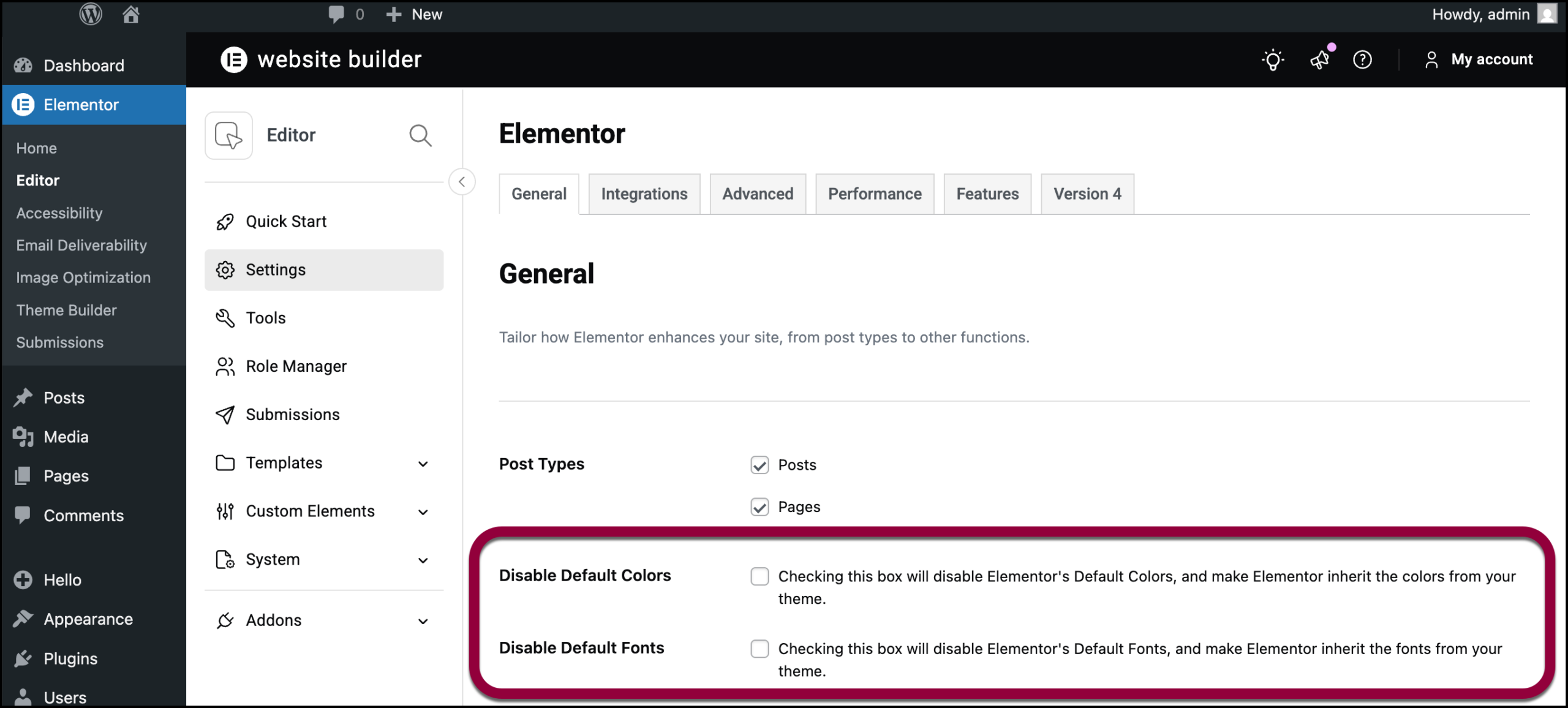 - From WP Admin, navigate to Elementor>Editor>Settings.