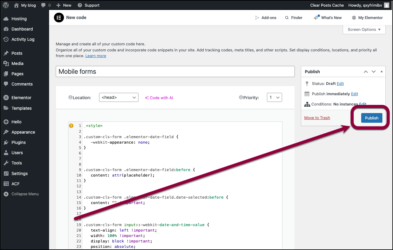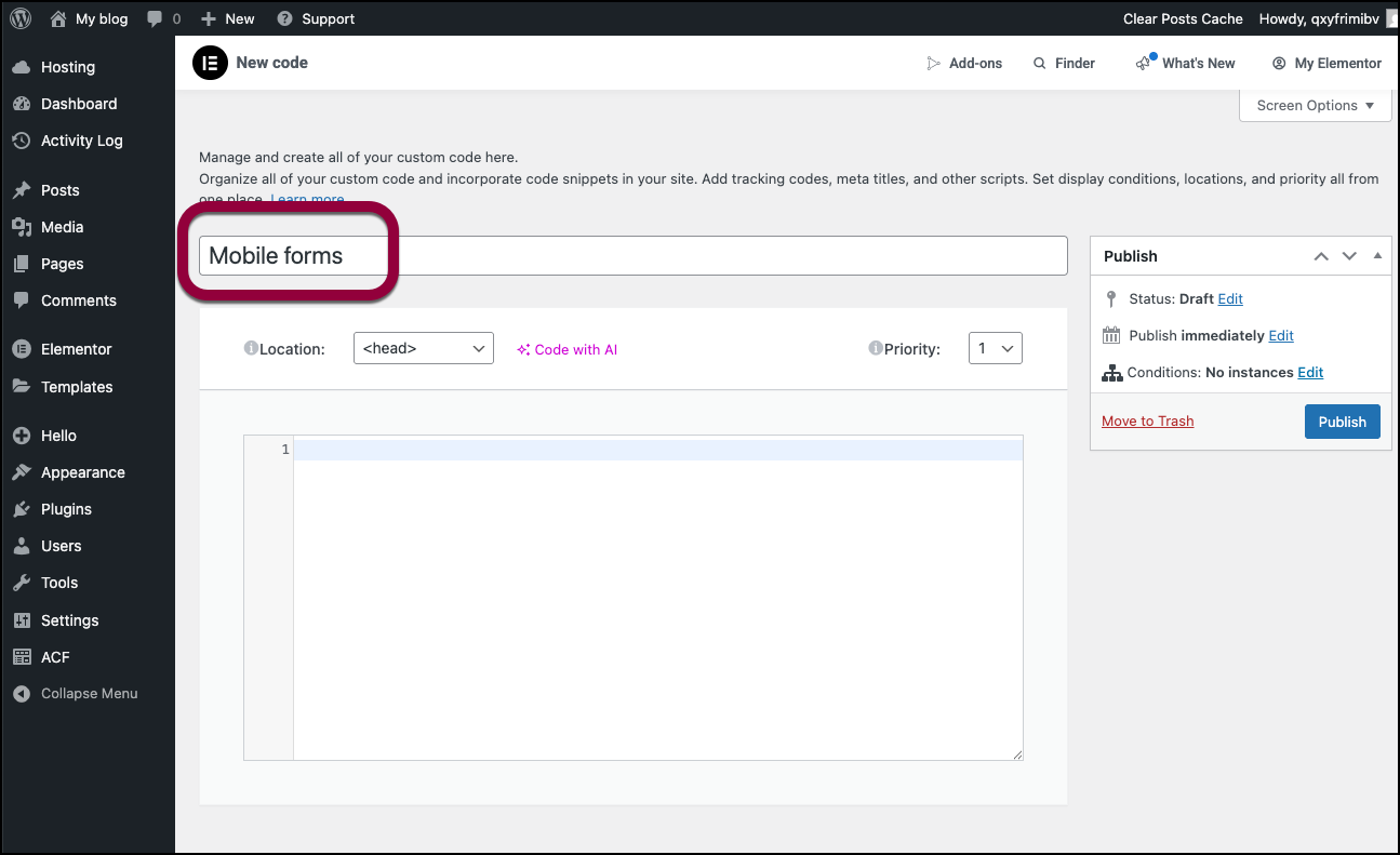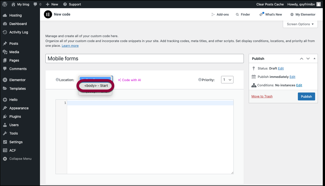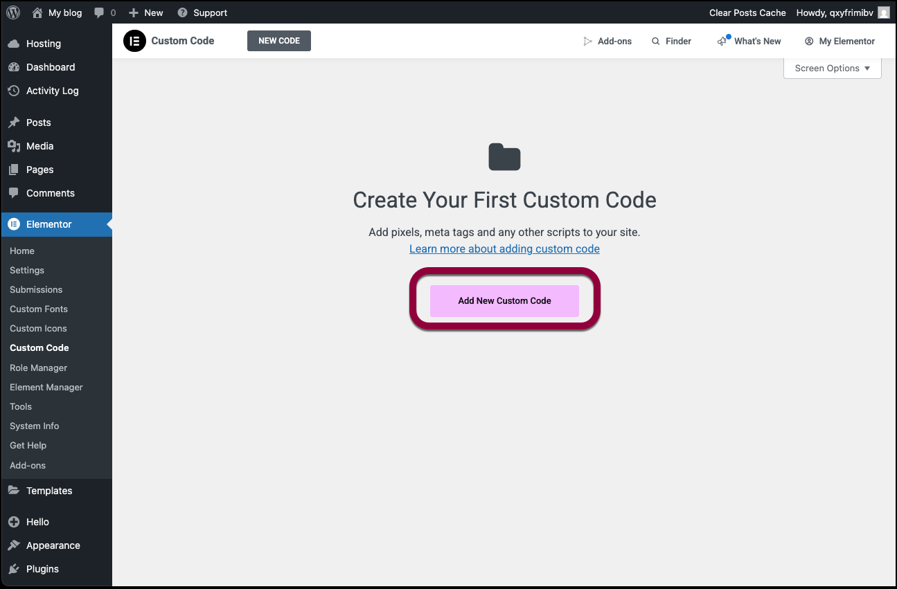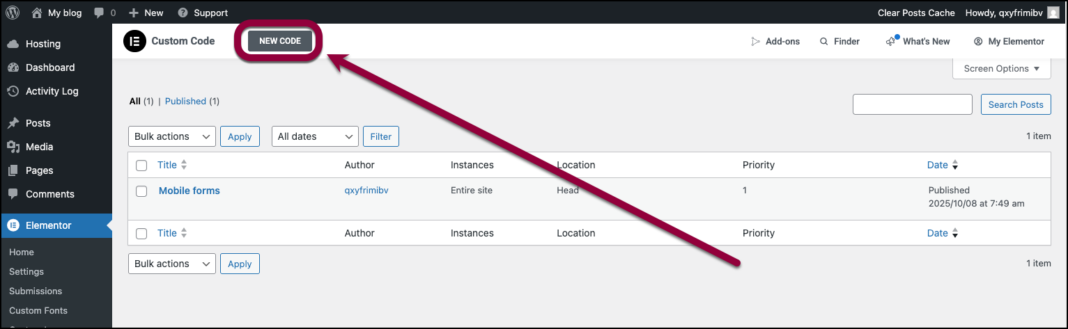 - Go to WP Admin and navigate to Elementor >Custom Code.