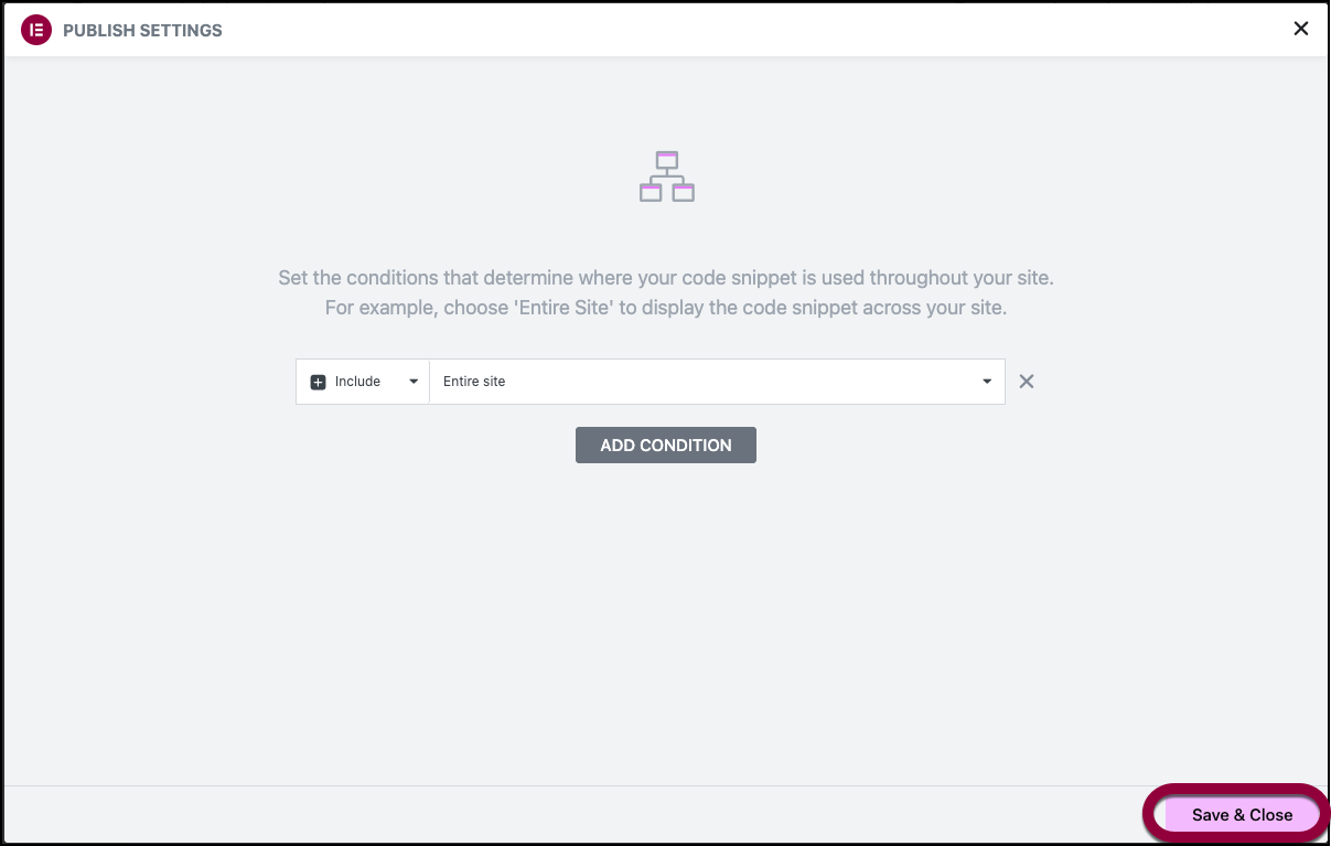 - Click Save & Close.NoteYou have the option of limiting where this code will apply but we recommend just applying it to the entire site. See Conditions, triggers, and advanced rules for details.