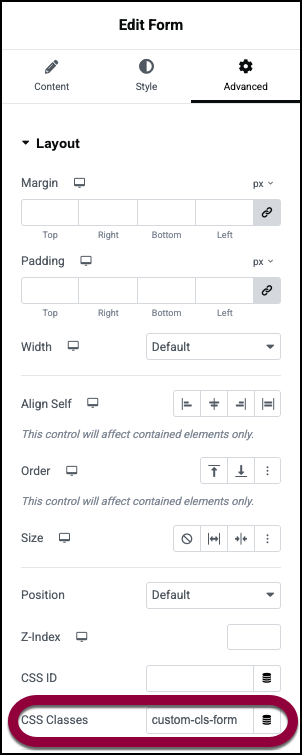 - In the Layout section, locate the CSS Classes field and enter custom-cls-form.