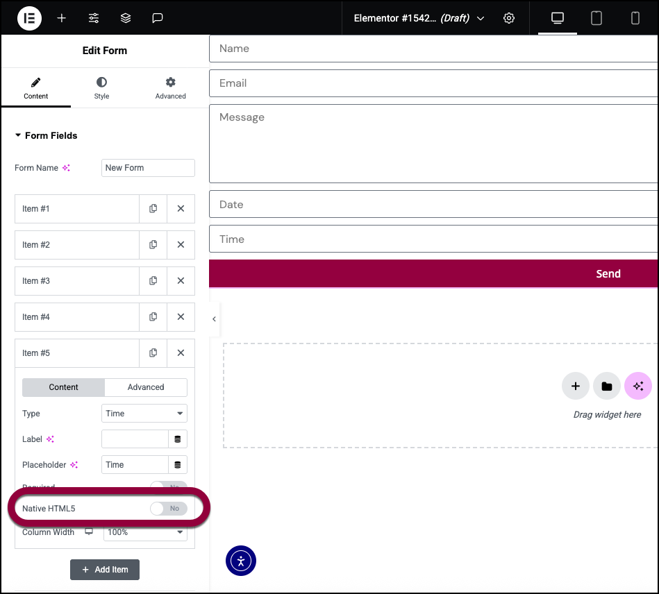 - Toggle Native HTML 5 off for this field