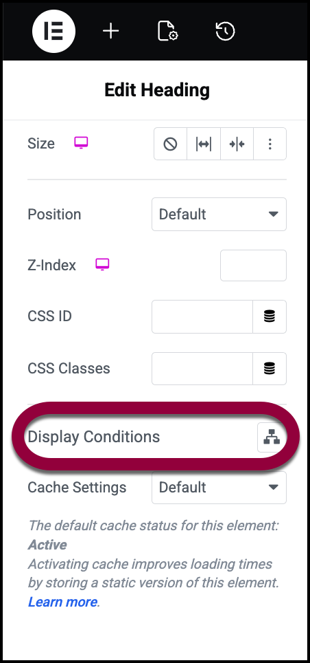 - Scroll down to Display Conditions and make sure there are no conditions stopping the element from displaying. For details, see Show and hide elements on a page.