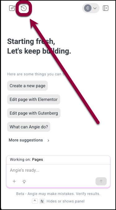 - In the Angie panel, click the history icon.