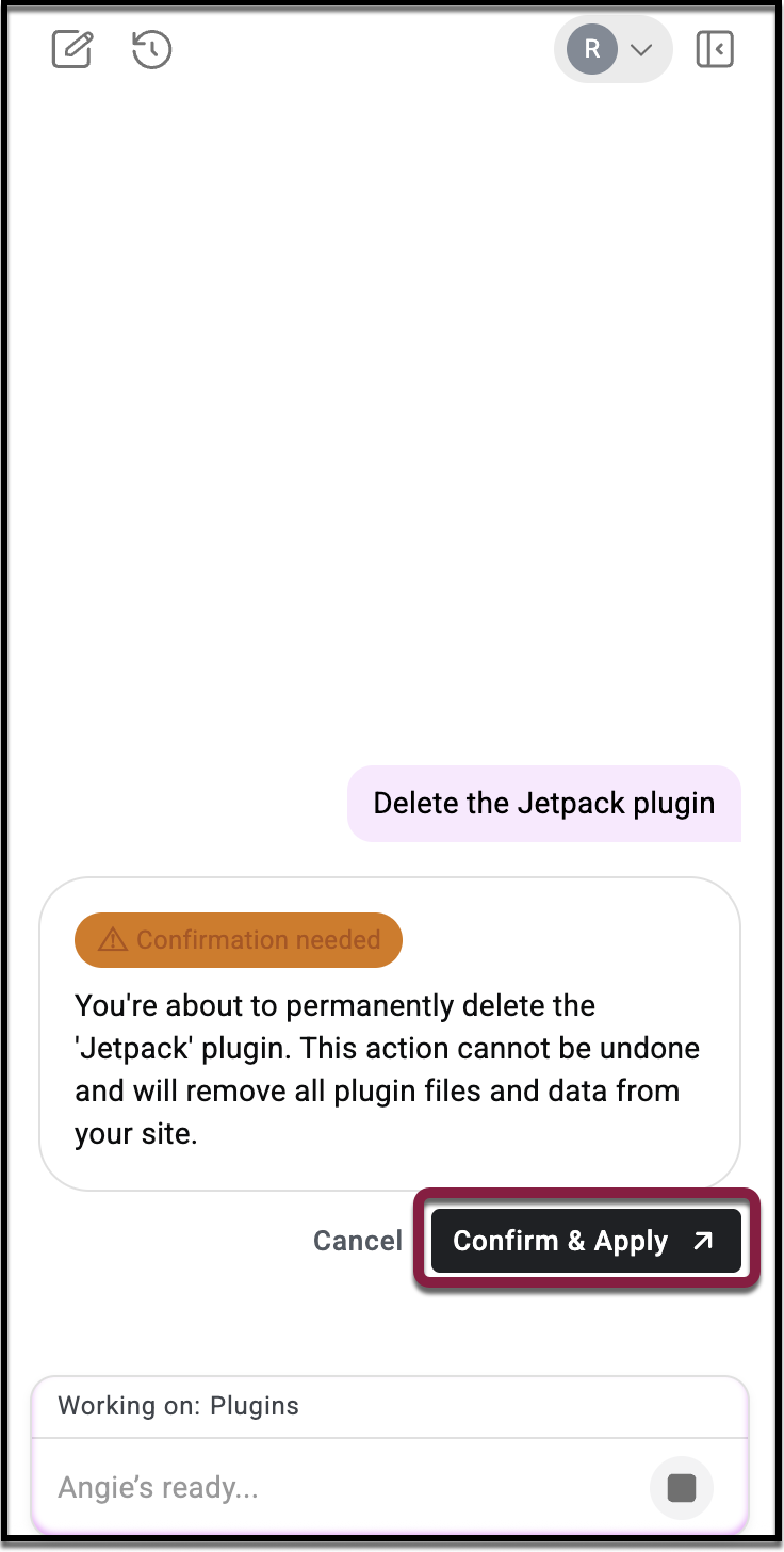 - Angie will ask you to confirm before deleting. Click Confirm and Apply. Once confirmed, the plugin is removed from your WordPress site.