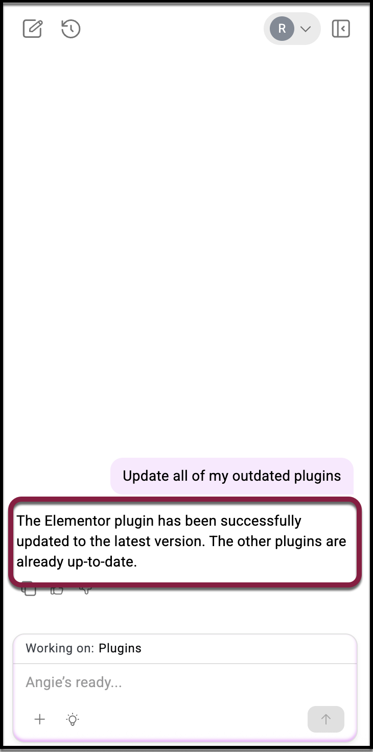 - From WP Admin, in the Angie panel, send the prompt. In this case, we’ll ask Angie to update all of our outdated plugins.