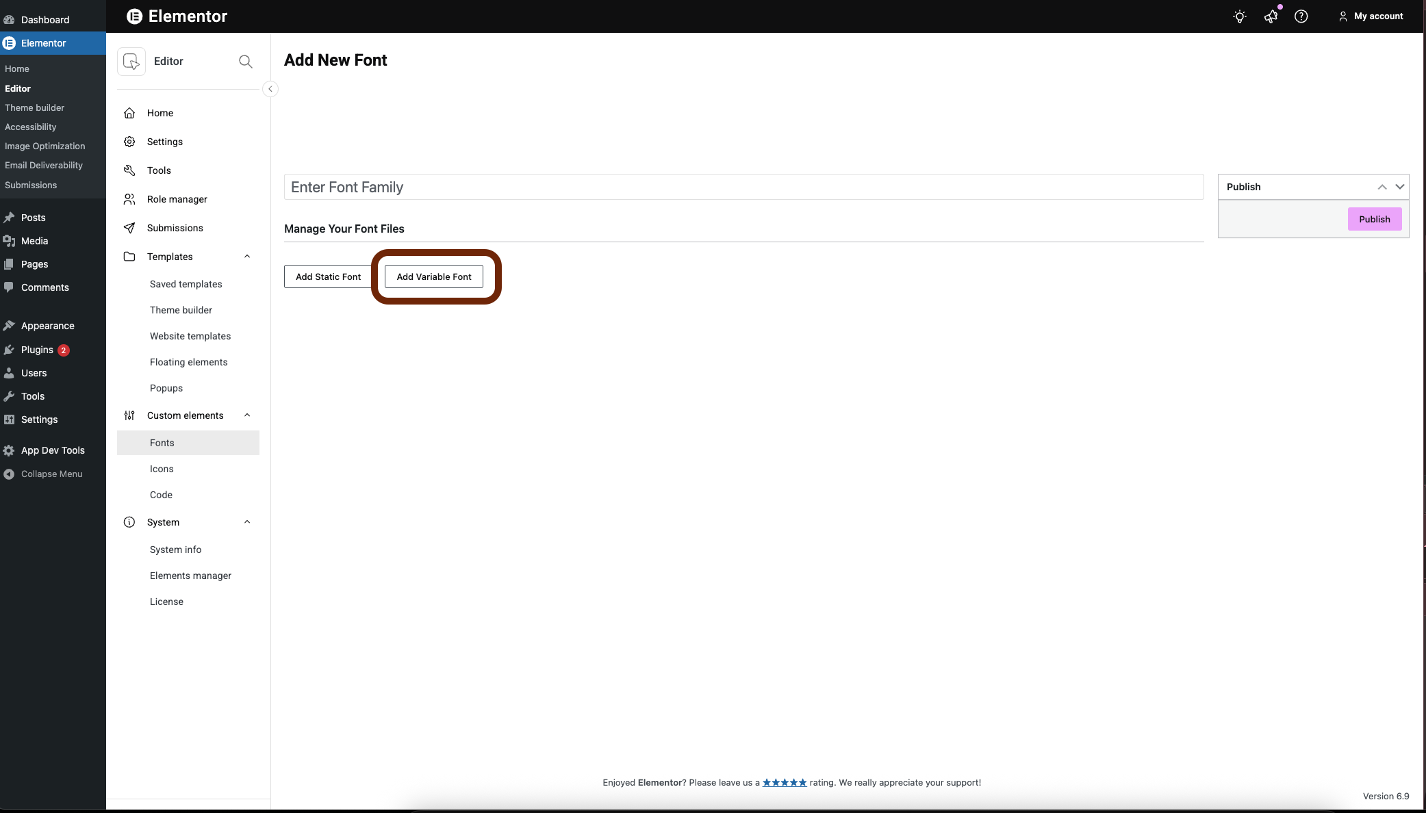 - Go to WP Admin and navigate to Elementor>Editor>Custom elements.