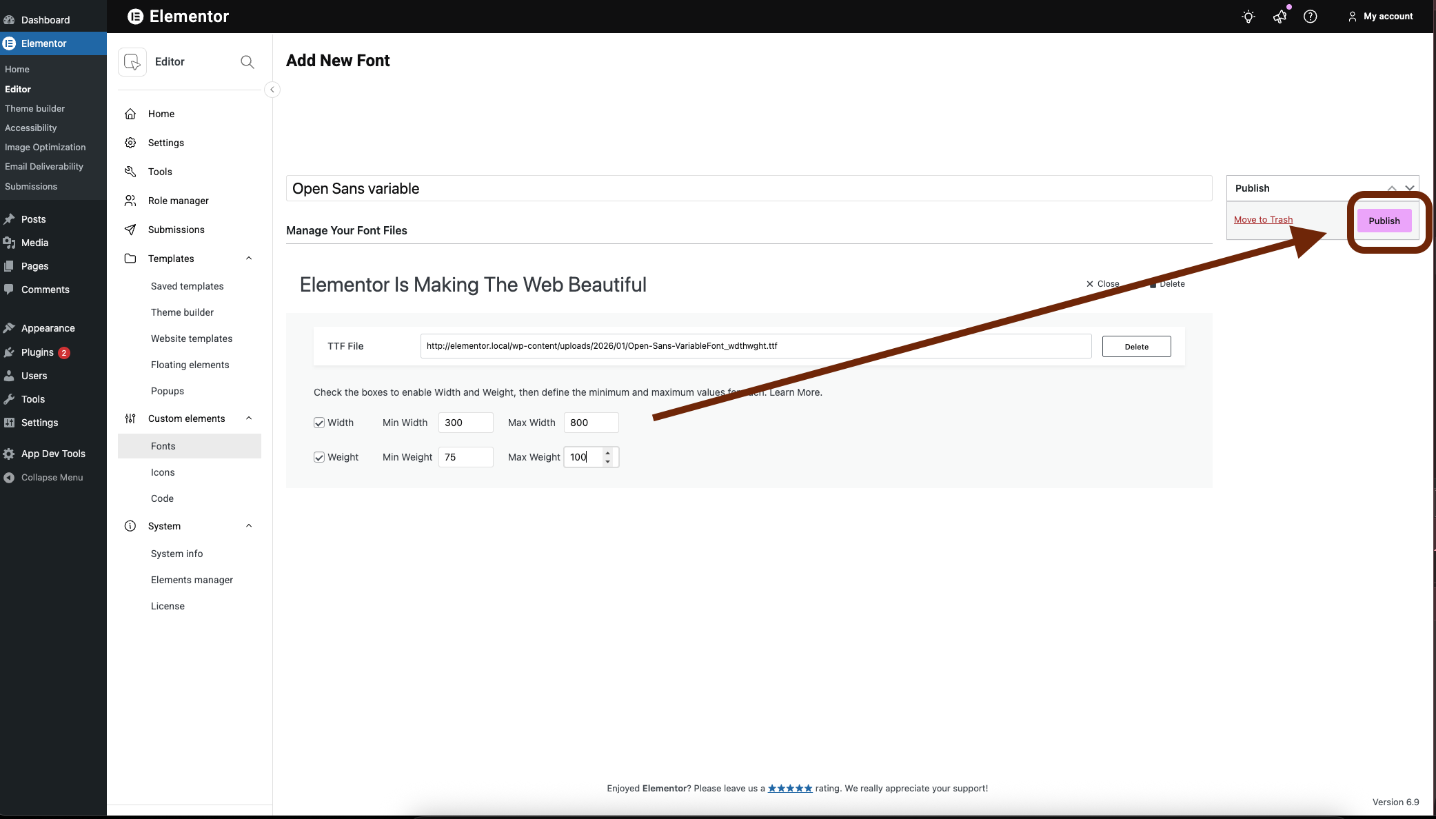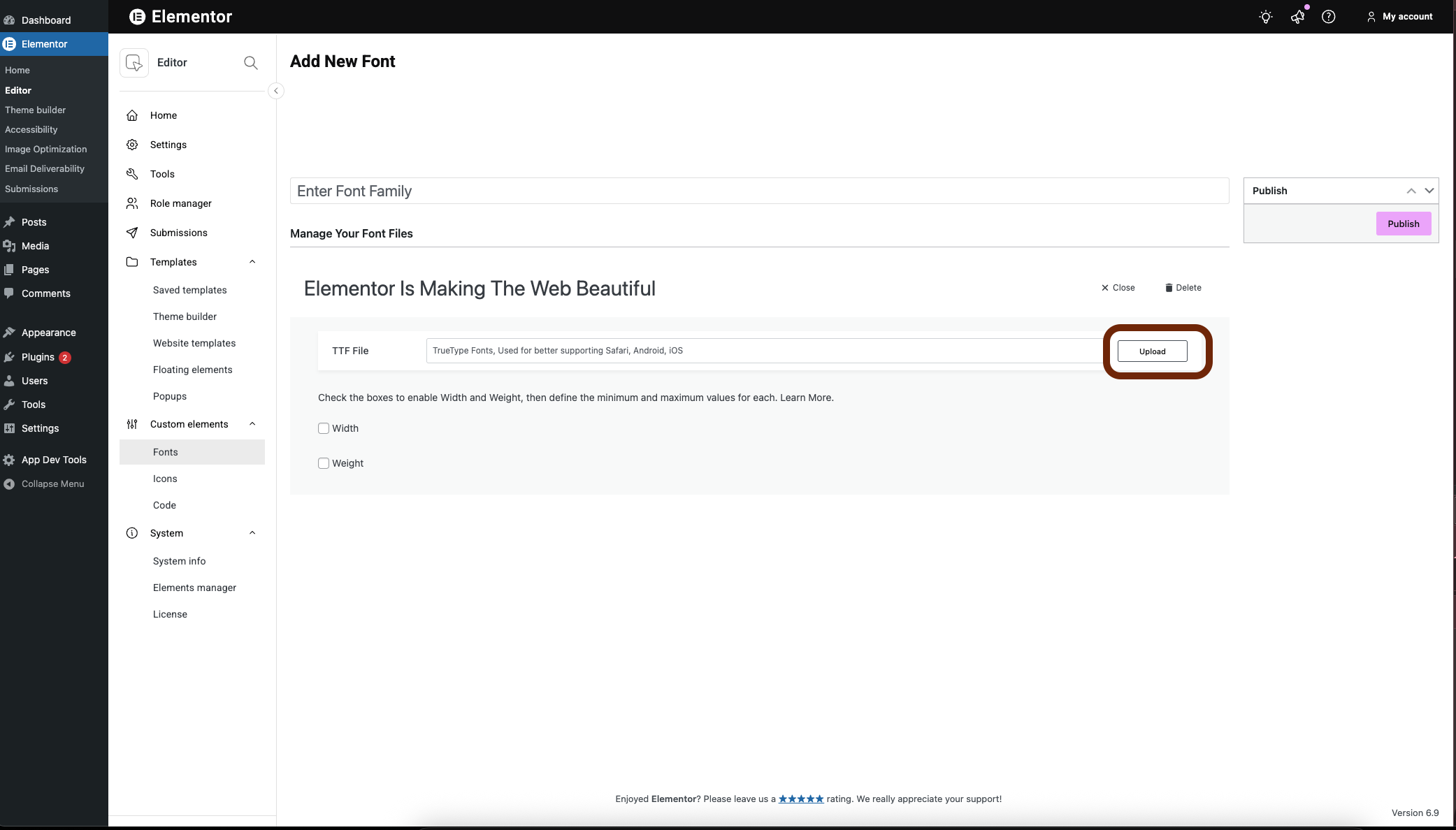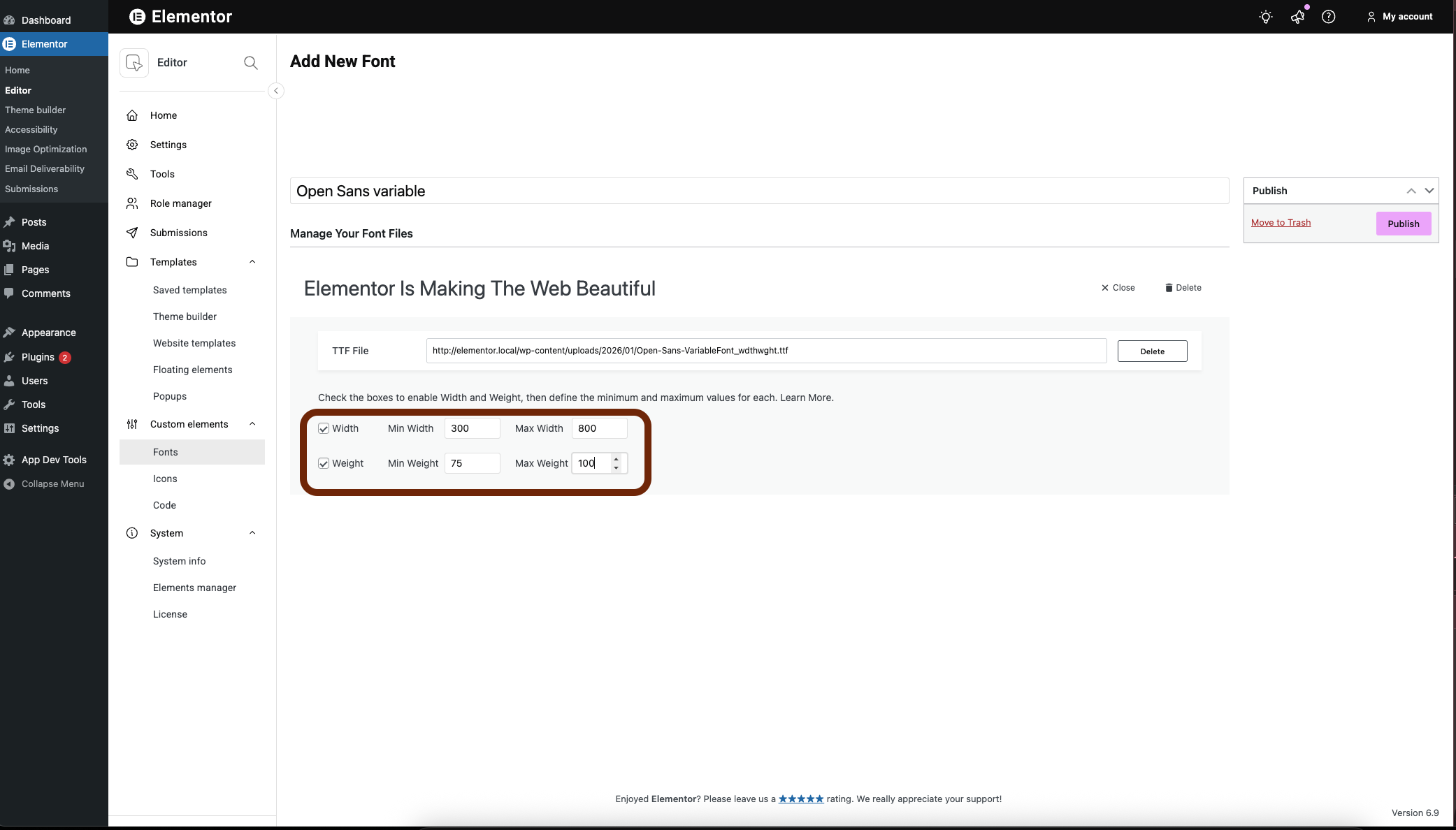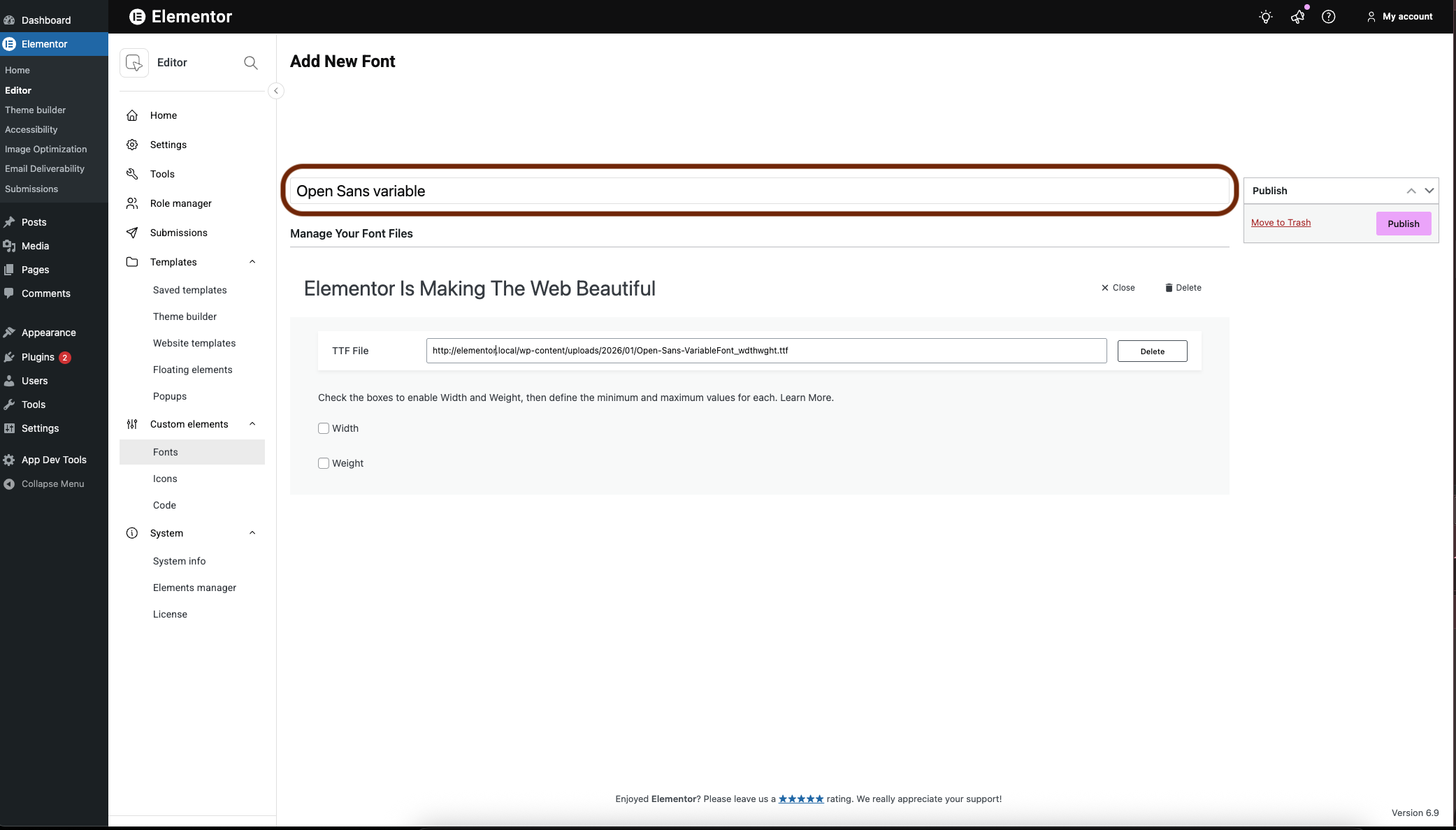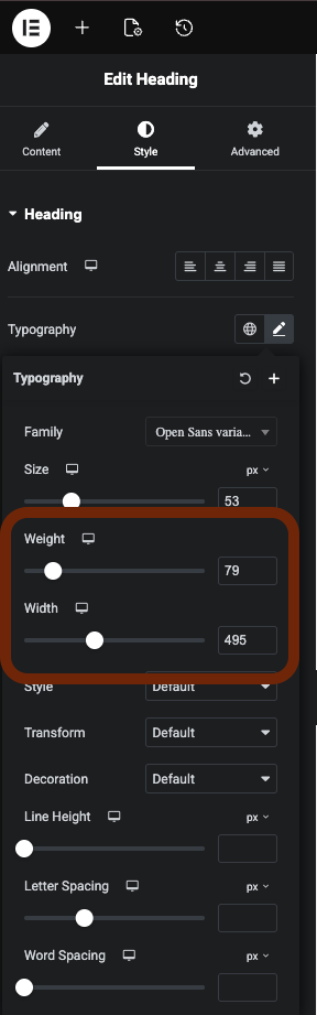 Note: Variable fonts have several variables you can use to adjust them. Width and weight are the two most commonly used and these two are supported in Elementor.