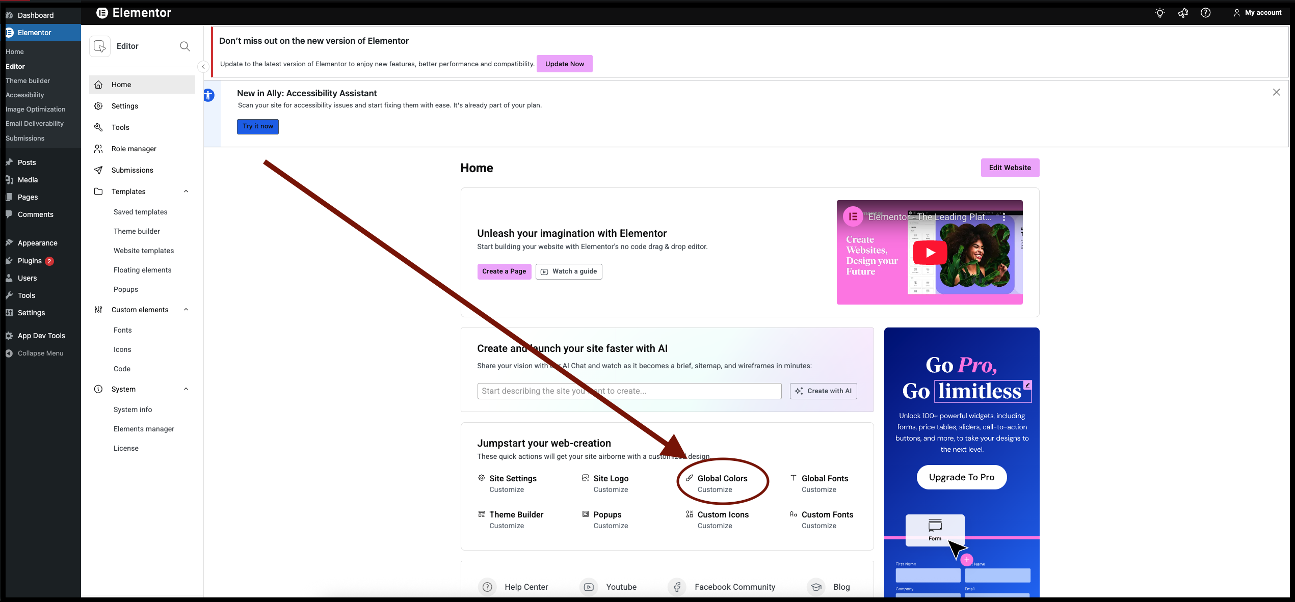 From the WordPress Dashboard, navigate to Elementor>Editor.