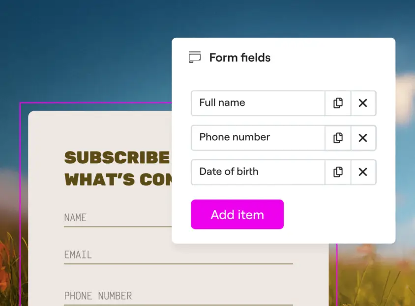 - Website elements like headings, text blocks, images, buttons, styles, motions, simple forms, floating elements, and more.