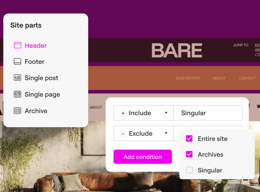 Customize headers, footers, and templates visually, giving clients cohesive websites with full control over pages, posts, products, archives, and search results.