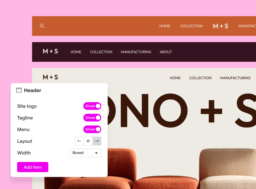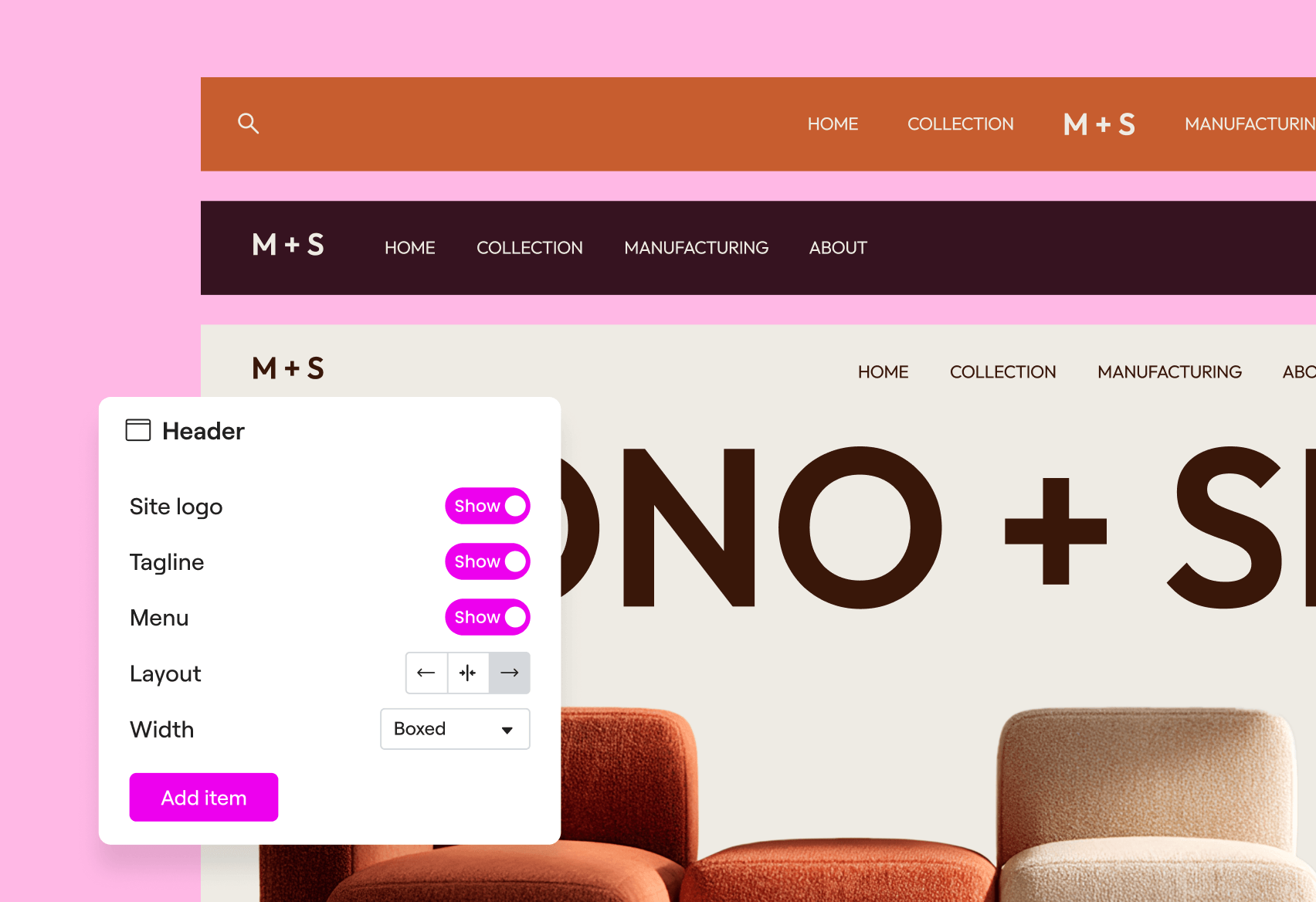Create clear and engaging navigation with customizable header and footer layouts to keep essentials like contact info, links, and CTAs in view.